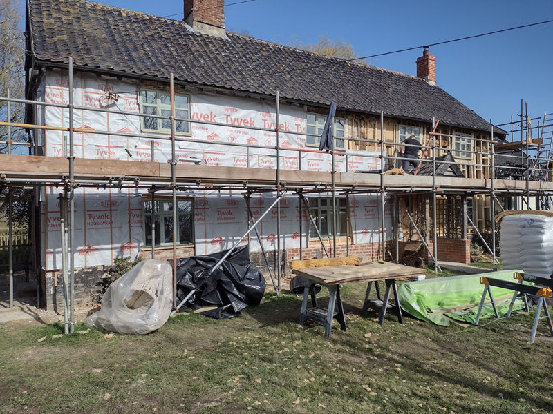 Waveney Build Ltd undertook an extensive rebuild of the entire front and side elevations of this timber-framed home. The house had been erroneously cement rendered around 50 years previously. The render was cracking in places and no longer adhered to the frame underneath. This inappropriate render material had caused the frame to rot to the extent that we had to build an entirely new frame within and in front of the existing timbers. While the work required was extensive, we managed to repair the building while the occupants remained resident in the house. We also retained the existing, internal oak posts, studs and beams to retain the character of the house and to minimise the all-important, overall costs.